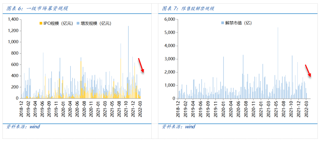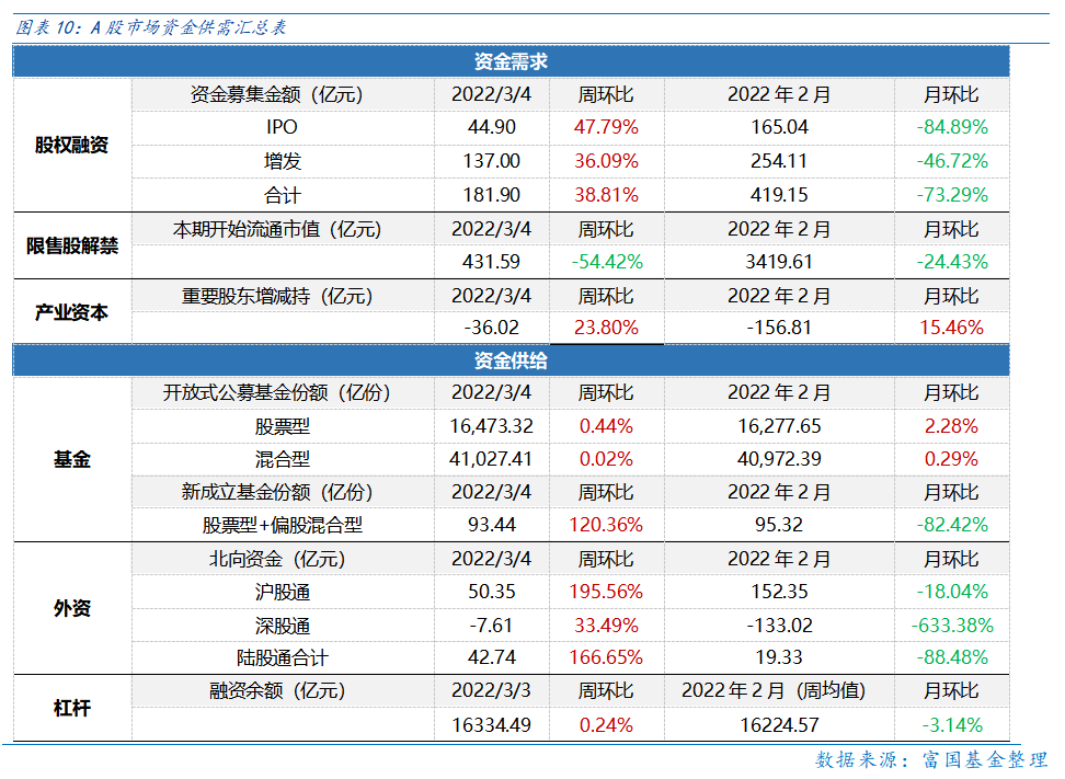 资金需求方面,本周一级市场规模回升,限售股解禁压力减小,重要股东减持规模增加。本周一级市场资金募集金额合计181.9亿元,较上周增加38.81%;结构上,IPO募集44.90亿元,周环比增加47.79%;增发募集137亿元,周环比增加36.09%。本周限售股解禁规模合计431.59亿元,周环比减少54.42%,根据目前披露的数据,预计下周解禁规模约9.08亿元,解禁压力将再度大幅下行。本周重要股东减持36.02亿元,上周减持34.27亿元,减持规模略增。