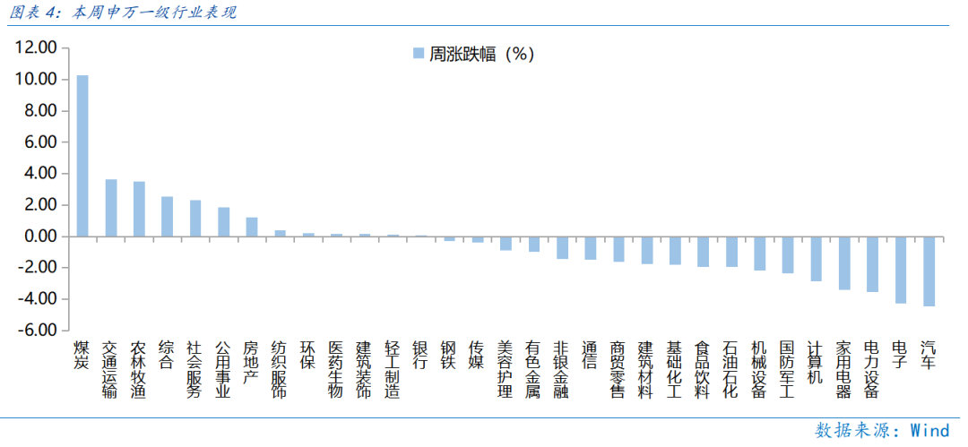 近一周,稳定风格占优。近一周,上证指数下跌0.11%,创业板指下跌3.75%,沪深300下跌1.68%,中证500下跌0.23%,科创50下跌3.05%。风格上,稳定、金融表现相对较好,成长、消费表现较差。从申万一级行业看,表现相对靠前的是煤炭(10.25%)、交通运输(3.65%)、农林牧渔(3.49%)、综合(2.52%)、社会服务(2.3%);表现相对靠后的是汽车(-4.47%)、电子(-4.26%)、电力设备(-3.54%)、家用电器(-3.41%)、计算机(-2.85%)。