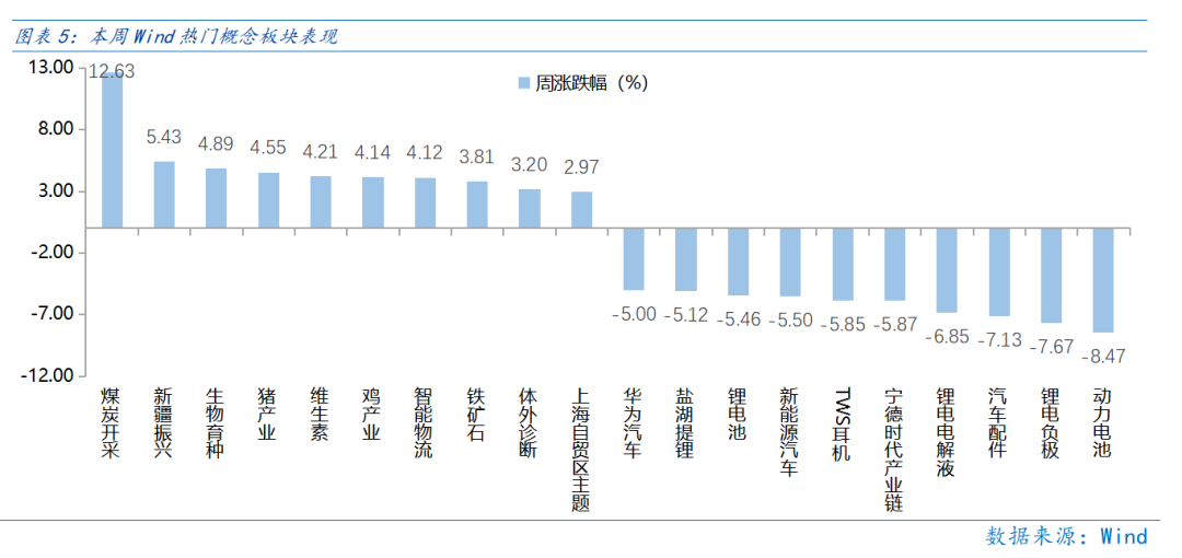 本周煤炭开采板块走强,地缘政治因素催高煤炭,市场情绪探底锂电产业遇冷。从Wind热门概念板块来看,表现相对靠前的是煤炭开采(12.63%)、新疆振兴(5.43%)、生物育种(4.89%)、猪产业(4.55%)、维生素(4.21%);表现相对靠后的是动力电池(-8.47%)、锂电负极(-7.67%)、汽车配件(-7.13%)、锂电电解液(-6.85%)、宁德时代产业链(-5.87%)。俄乌局势影响扩散,国际能源形势日趋紧张,俄罗斯煤炭出口业务受阻,高油价下煤制燃料盈利显著改善,周内煤炭开采相关个股热度居高不下。