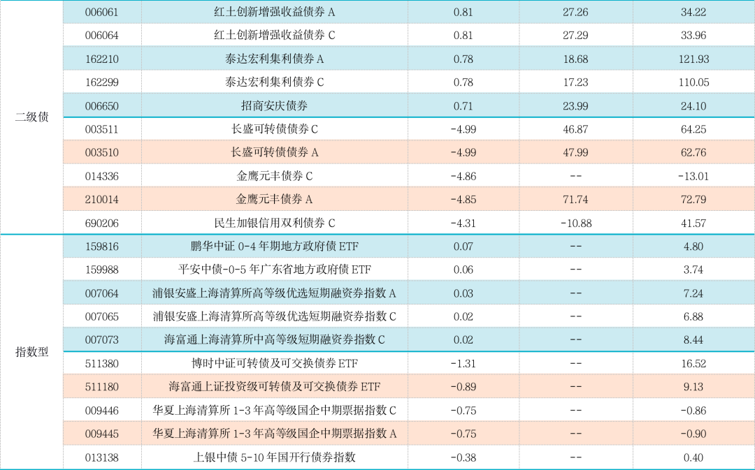 债市整体走弱,两成纯债型和不足一成债券指数型基金近一周净值收益率为正;权益市场震荡下行,不足一成一级债及二级债产品近一周净值收益率上涨。其中,纯债型基金近一周平均净值收益为-0.08%,一级债基金近一周平均净值收益为-0.35%,二级债基金近一周平均净值收益为-0.75%,债券指数型基金近一周平均净值收益为-0.16%。