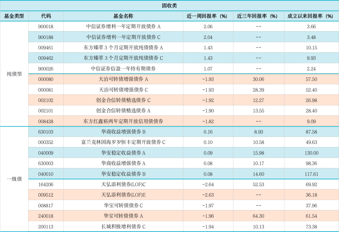 表3:上周固定收益类基金收益表现(涨幅前5位及跌幅前5位)