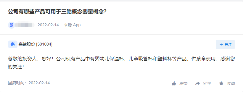嘉益股份回复投资人称,现有产品包括婴幼儿保温杯,儿童吸管杯和塑料杯等产品,供孩童使用。