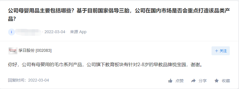 今日涨停的孚日股份也于3月4日回复关于三胎相关产品的问题时说,公司有母婴用的毛巾系列产品,公司旗下教育板块有针对2-8岁的早教品牌悦宝园。