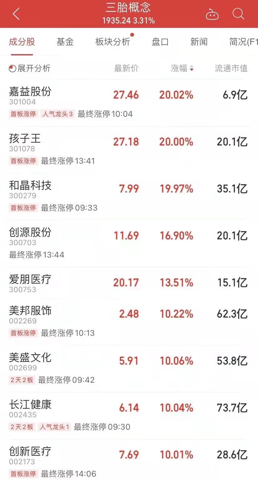 2022两会,有关“三孩”、生育和教育的话题多次被提起。今日早盘中,婴童概念开始发酵,行情自辅助生殖始,逐渐发散至教育、儿童医药等细分板块,核心概念轮番掀起涨停潮。今天整个A股,64股涨停,三孩概念股就有17股涨停。