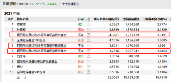 具体来看,阿巴马悦享红利26号私募证券投资基金持有金博股份123.31万股,持股市值4.38亿元;阿巴马悦享红利55号私募证券投资基金持有107.06万股,持股市值3.8亿元;阿巴马悦享红利25号私募证券投资基金持有105.72万股,持股市值3.75亿元。