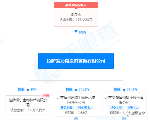 据天眼查,谢良志对拉萨爱力克公司持有100%的股权,并通过这家公司控股一家科创板公司——北京神州细胞生物技术集团股份公司,同时还担任该公司董事长。