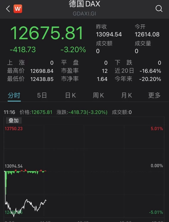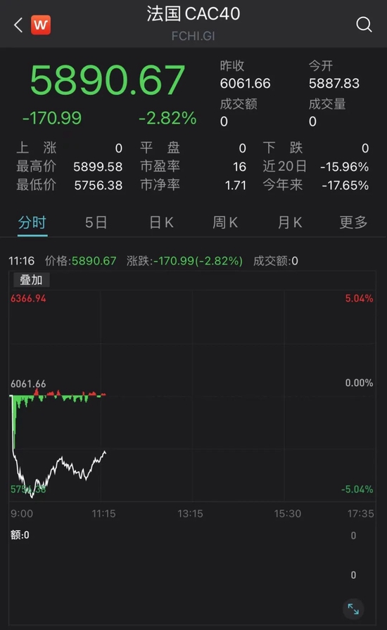 欧洲股市开盘后也接力下挫,德法股市开盘后不久一度大跌5%。