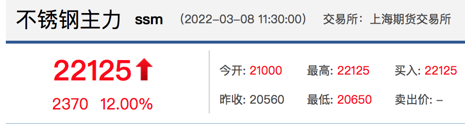 8日早间,不锈钢主力合约也一度冲至涨停板,截至上午收盘,报涨12%。