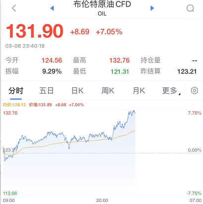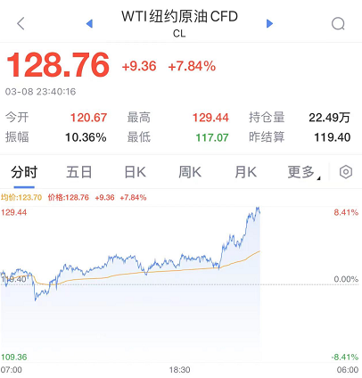 8日晚间,原油价格再度飙涨。据环球网,俄乌爆发冲突之际,美联社8日援引知情人士透露称,美国总统拜登已决定禁止俄罗斯石油进口,以此加大对俄罗斯经济的打击力度。美联社称,这一决定是在乌克兰总统泽连斯基向美国和西方官员请求切断(俄罗斯石油)进口之后做出的。