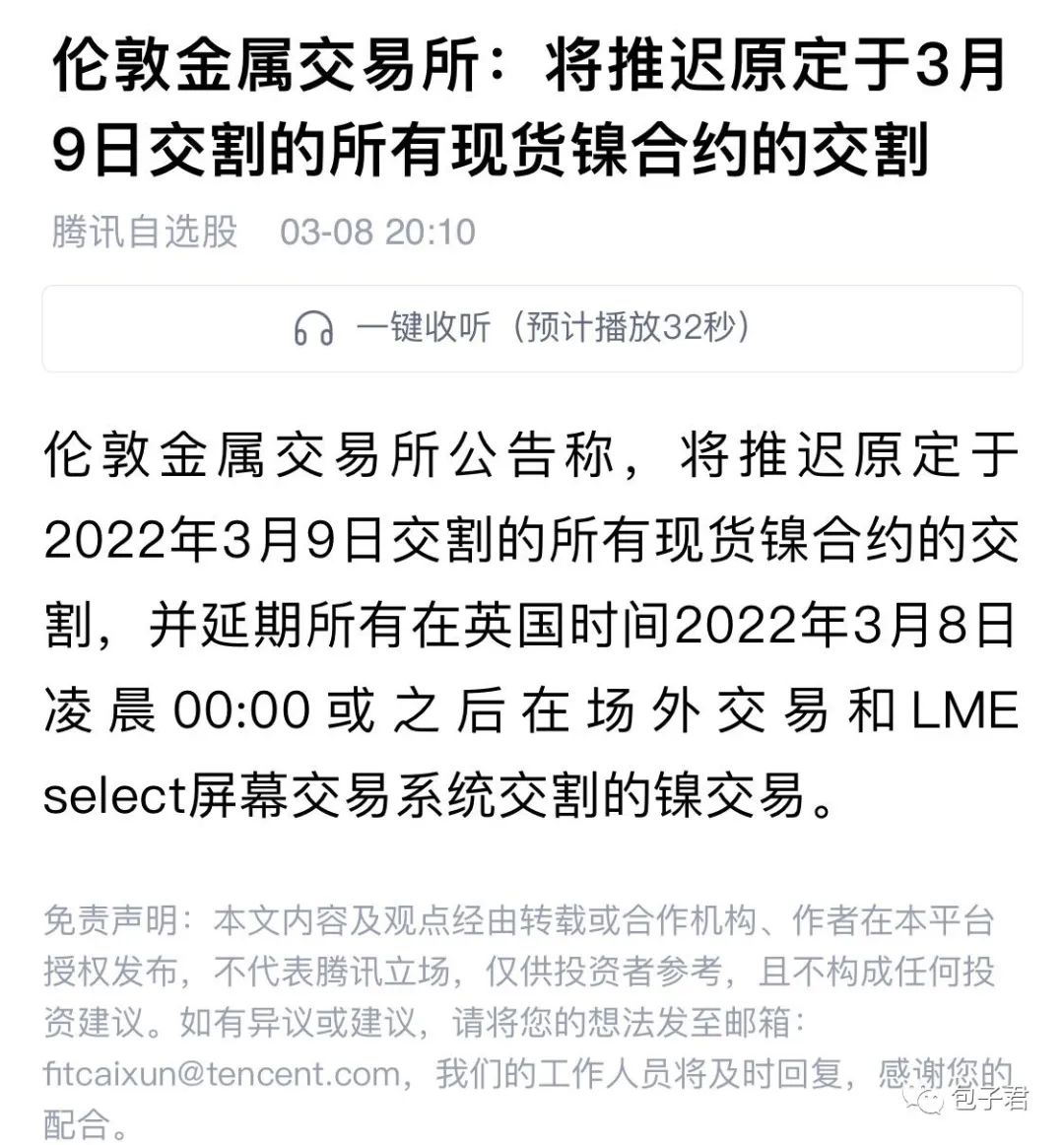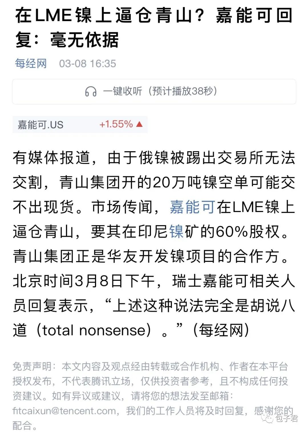 最新的消息是LME修改了规则:无法交割的头寸能延迟交货,并推迟原定于3月9日交割的所有现货镍合约的交割。也就是这次交不出来现货,可以下次或者下下次再交货。只要能给青山足够多的时间,青山是能交货的,它拥有全世界最大的镍生产企业,可以把镍铁、高冰镍转生产为纯镍来交货。