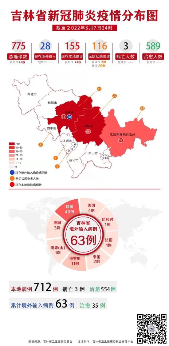 3月8日,吉林省卫健委官网通报,3月7日0-24时,吉林省新增本土确诊病例46例(其中轻型45例、普通型1例),其中吉林市28例(含3例无症状感染者转为确诊病例)、长春市17例、延边州1例;新增本地无症状感染者29例,其中吉林市19例、长春市6例、延边州3例、梅河口市1例。