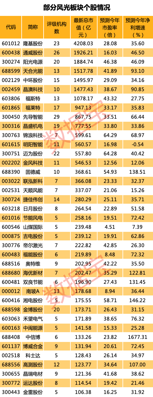 数据宝统计,风能光伏概念方面,5家以上机构评级个股中,隆基股份、通威股份、阳光电源等个股市值超过千亿元。从今明两年成长性来看,阳光电源、天合光能、晶澳科技等个股净利增速均超过30%。(数据宝 陈见南)