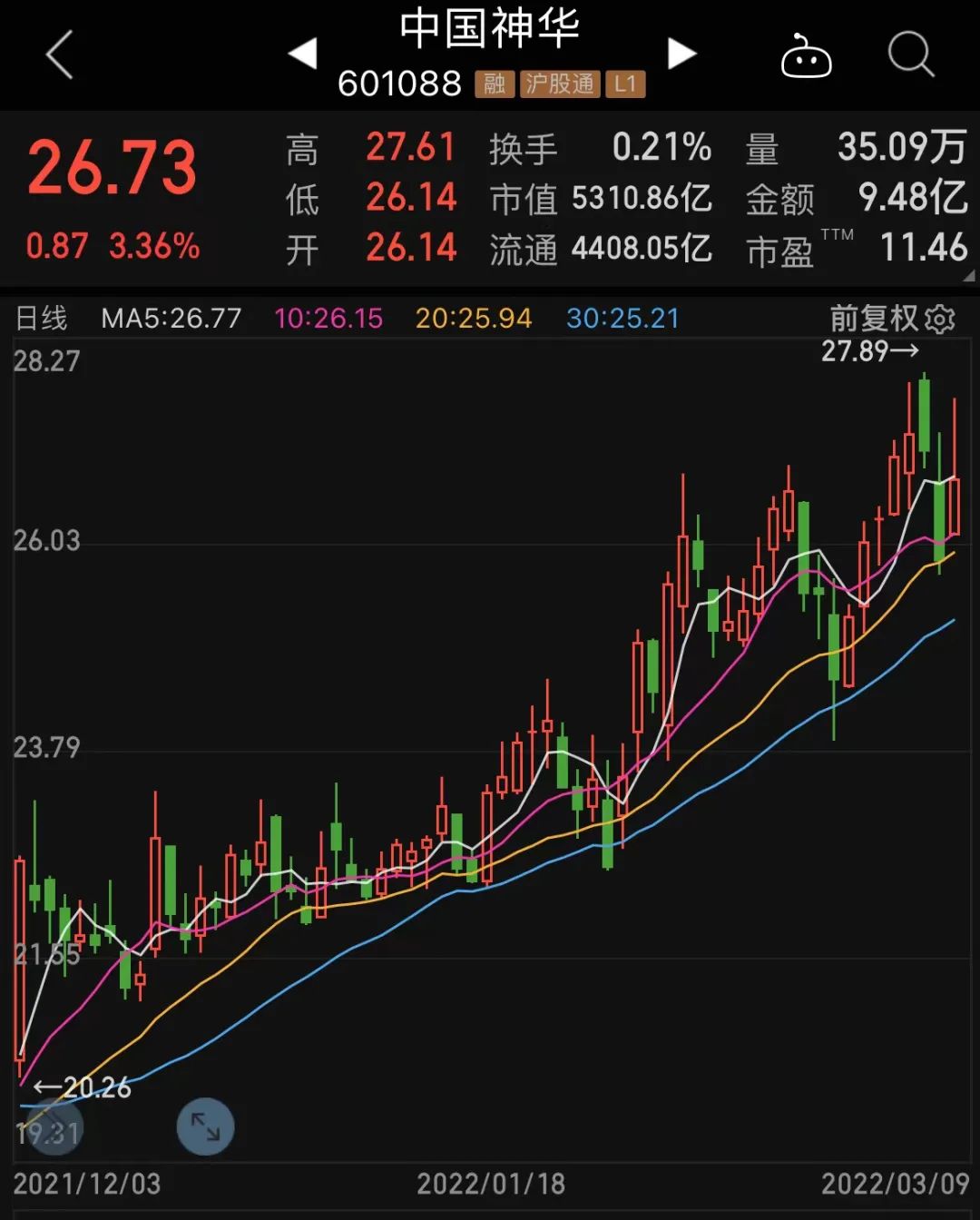 早盘煤炭板块涨幅居前,山煤国际、平煤股份、潞安环能等多股大涨逾3%。值得一提的是,煤炭行业龙头中国神华近期一度连续创出阶段新高,今天早盘大涨4.45%,市值突破5000亿元,盘中最高达到27.61元,逼近此前新高。