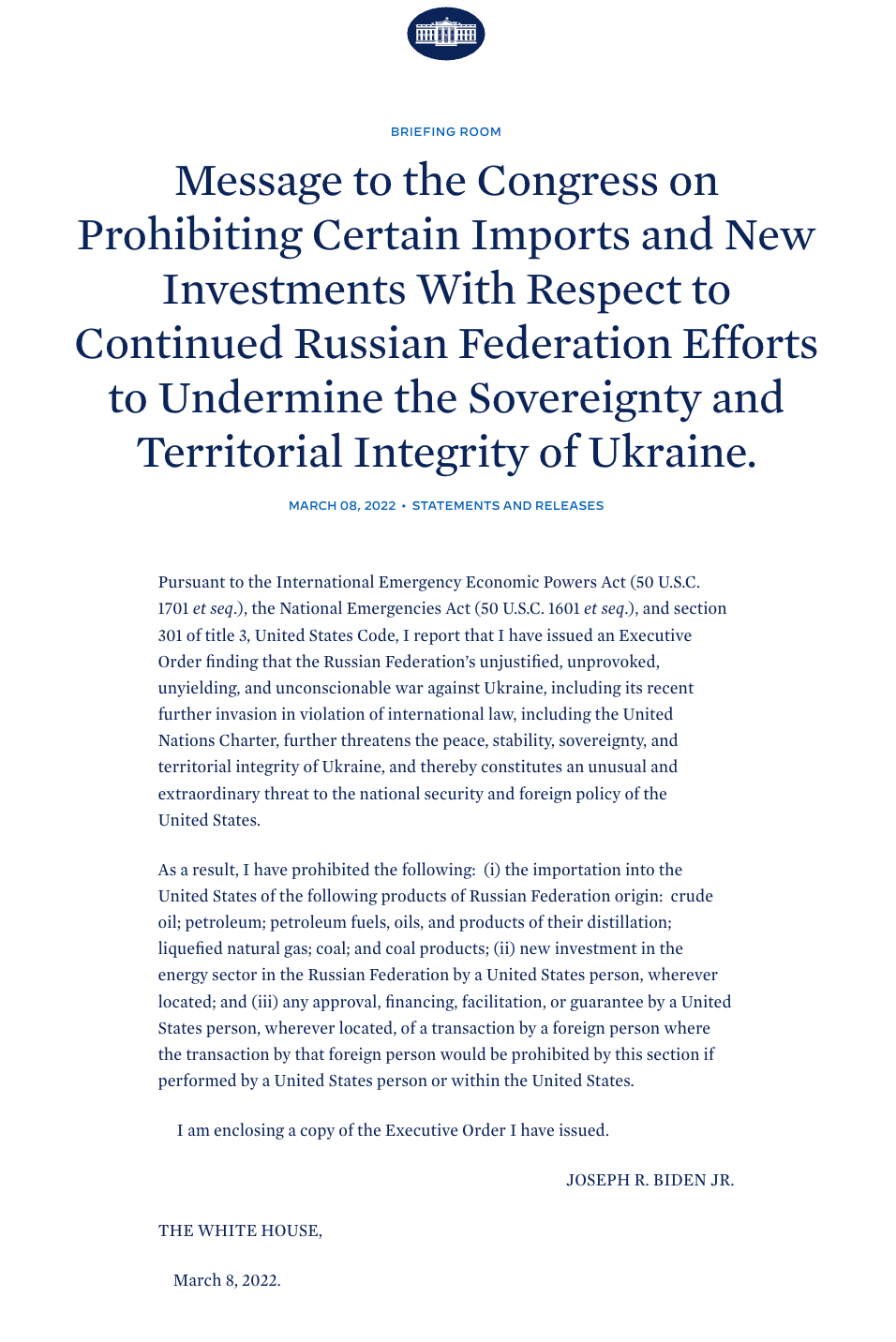 煤炭股更大的消息面还在于海外。当地时间3月8日,美国白宫在其网站上发表声明,称美国总统拜登正式签署了禁止美国从俄罗斯进口能源的行政令。声明中详细介绍了这项行政令的内容,其中包括:禁止进口俄罗斯原油和某些石油产品、液化天然气和煤炭;禁止美国对俄罗斯能源部门的新投资;禁止美国人资助或支持在俄罗斯投资能源公司等。