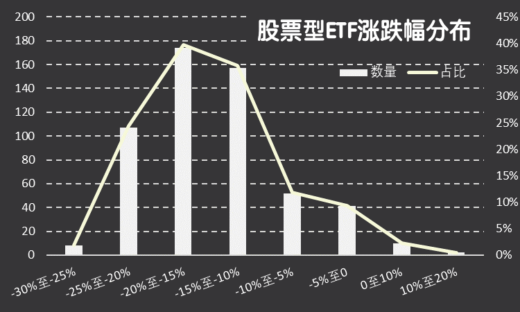 股票型ETF的表现就惨了,全部551只股票型ETF中,上涨的数量只有11只,连3%都不到。
