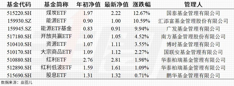 而涨幅比较大的那几个ETF产品,我觉得不用说大家也都能猜到,无非就是那些大宗商品ETF或者是强周期行业的股票ETF。