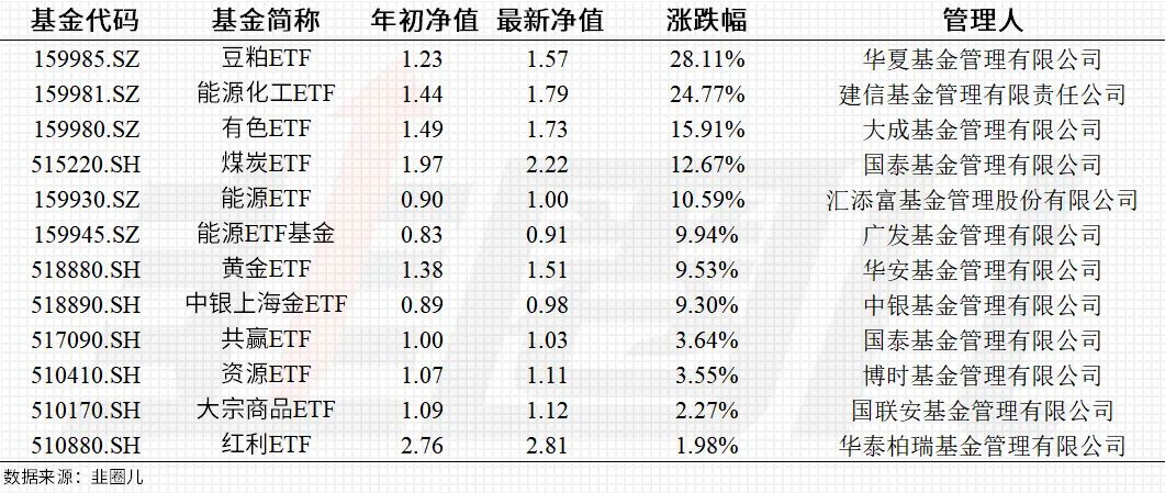 豆粕ETF以28.1%的涨幅位居第一,其他涨幅较高的ETF包括能源化工、有色、煤炭等周期类产品。