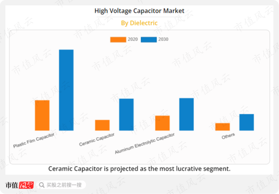 以高电压电容器市场为例,预计到2030年,市场规模将达到300亿美元,自2021年起算的CAGR将达到近10%。届时,薄膜电容器的市场份额将远超其他品类,而陶瓷电容器的增长空间也将大于铝电解电容器。