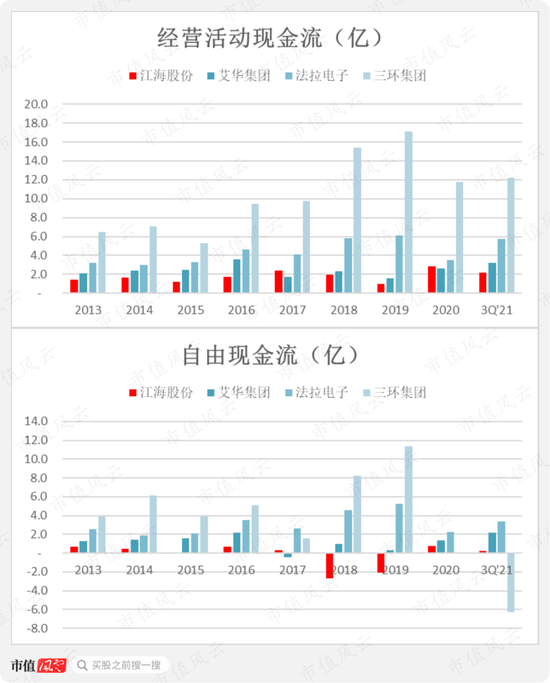 过去这8年多,公司通过经营活动赚到的钱垫底,为17亿,艾华集团为22亿,法拉电子接近40亿,三环集团高达95亿。