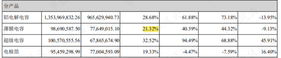 不仅如此,超级电容的毛利率也高,2021年上半年为32.5%,要高于铝电解电容的28.7%。