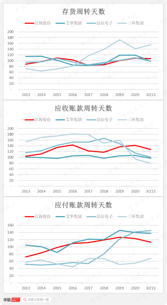 具体来看,四家公司当中,三环集团的存货周转天数明显偏长,比其他三家长近2个月,说明存货流动性偏弱、资金占用较高。
