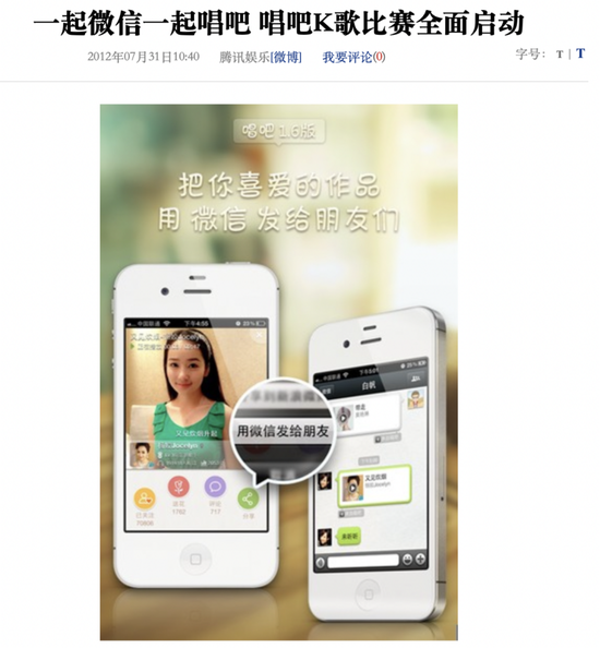 这里需要重点提到唱吧与微信的合作,双方在2012年7月推出《一起微信,一起唱吧!》大型手机K歌比赛。参与方式轻松简单,苹果及安卓手机用户下载最新版“唱吧”将喜欢的音乐作品通过“微信”进行分享即视为参赛。