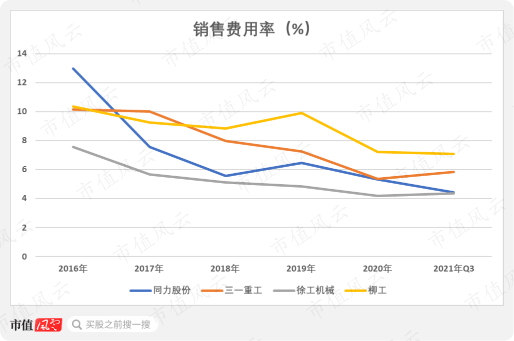 销售费用在工程机械公司的各项费用中金额最大。同力股份随着营收规模快速增长,销售费用率在2020年已经下降至5.31%,与三一重工接近,低于柳工的7.23%,费用管控能力较强。
