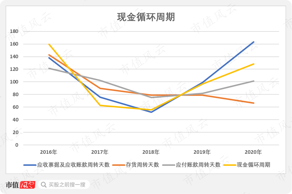 现金循环周期走势相似,2020年回升至128天,资金占用天数越来越长。