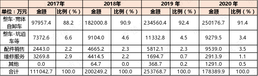 公司的主要产品是非公路宽体(含矿用)自卸车和坑道车、工程洒水车、桥梁运输车等工程机械,每年超90%的收入来源是非公路宽体自卸车,坑道车的收入增长相对很慢,占比极低。