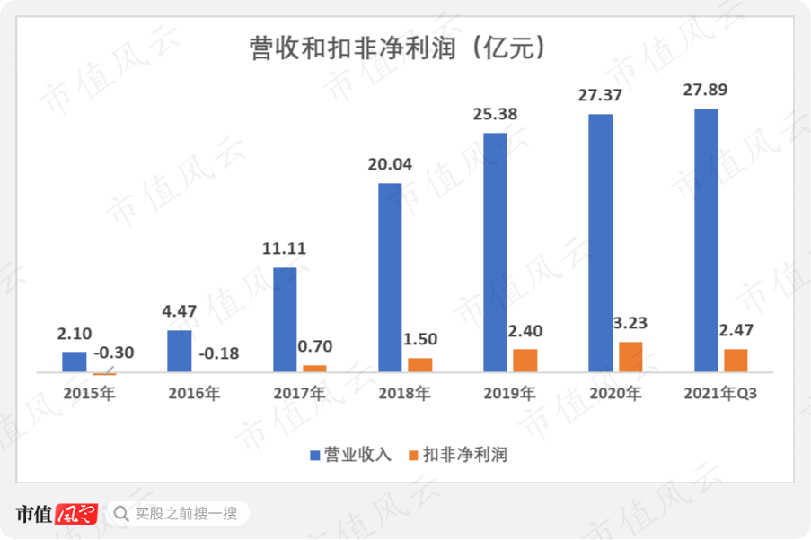 扣非净利润在2015-2016年亏损,自2017年起从0.7亿增长至3.23亿,复合增速达66.5%,2021年Q3仅小幅增长。