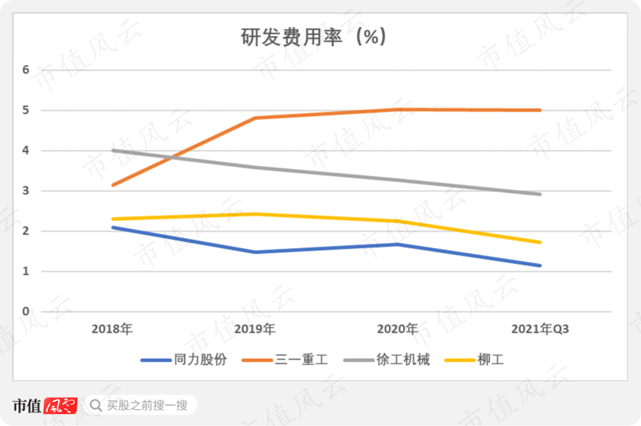而在研发上,公司的投入就明显少于其他3家公司,研发费用率还不及2%,而三一重工表现最好,研发费用率呈上升趋势,2020年以后已突破5%,研发强度明显高于同行业其他公司。