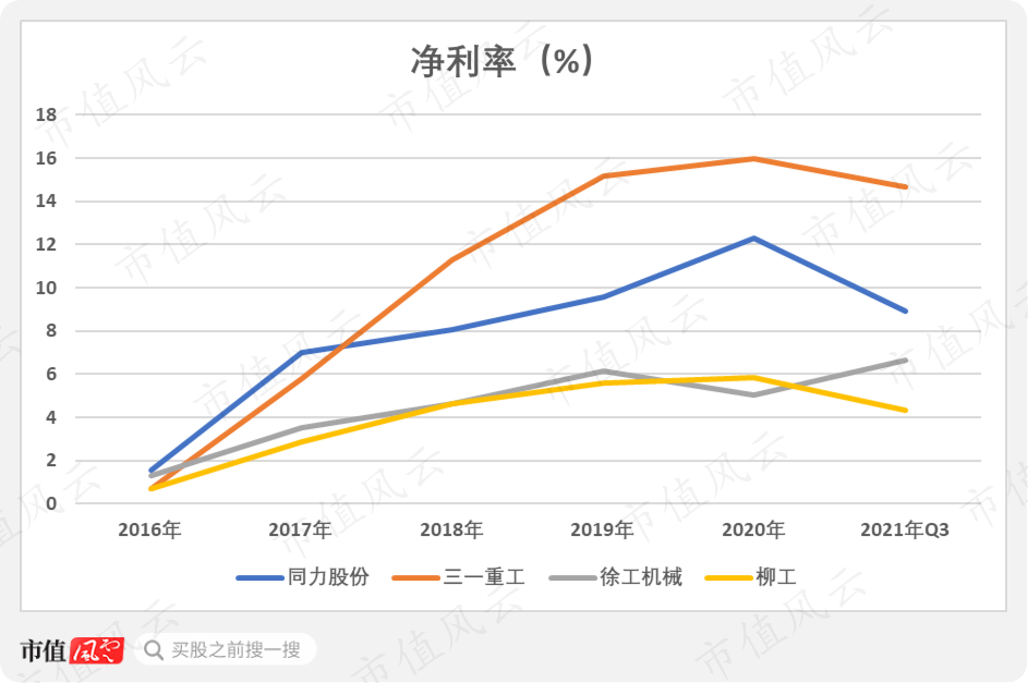 而从净利率的趋势看,工程机械行业上市公司近年来经历了一轮快速上升的阶段,其中三一重工的弹性最大,净利率从2016年的0.7%快速上升至2020年的15.97%,同力股份表现相对较好,2020年为12.29%,徐工机械和柳工表现一般。