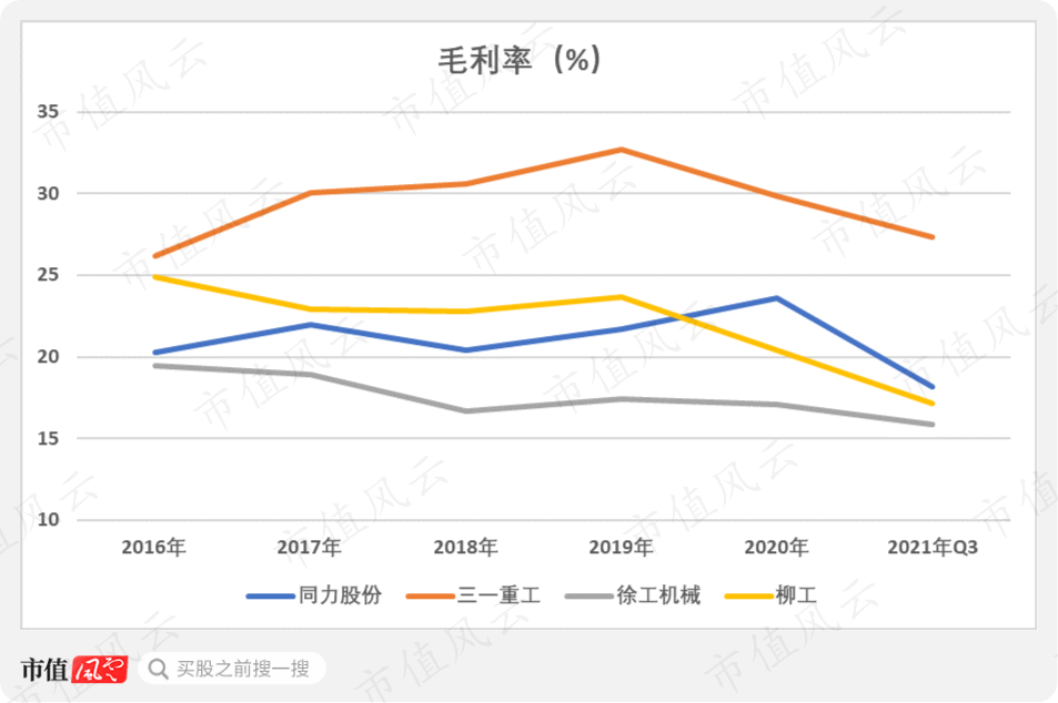 与同行3家工程机械巨头相比,三一重工(600031.SH)遥遥领先,柳工(000528.SZ)与公司水平相近,徐工机械(000425.SZ)最低,毛利率常年低于20%。