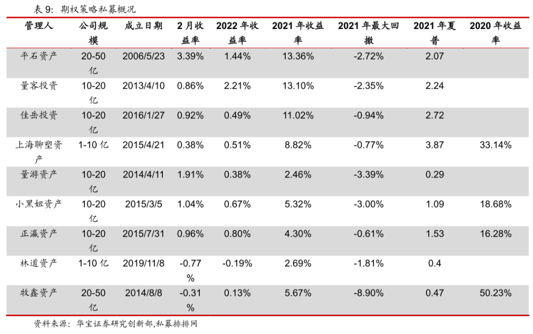 期权策略,2月收益率有七家为正,最高的是平石资产,录得了3.39%的单月收益。2021年收益最高的是平石资产,录得了13.36%的收益,夏普比最高的是聊塑资产的3.87,最大回撤幅度最小的是正瀛资产的0.61%。