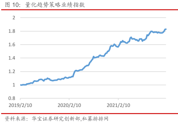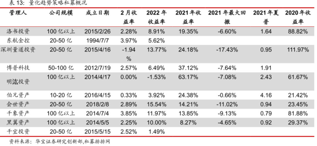 量化趋势策略,过去一年收益率排名前十中有五家管理规模超五十亿,2月收益率有八家为正,最高的是东航金控,录得了3.97%的单月收益。2021年收益最高的是明汯投资,录得了63.17%的收益,夏普比最高的是伯兄资产的4.16,伯兄资产的最大回撤幅度最小,为0.66%。