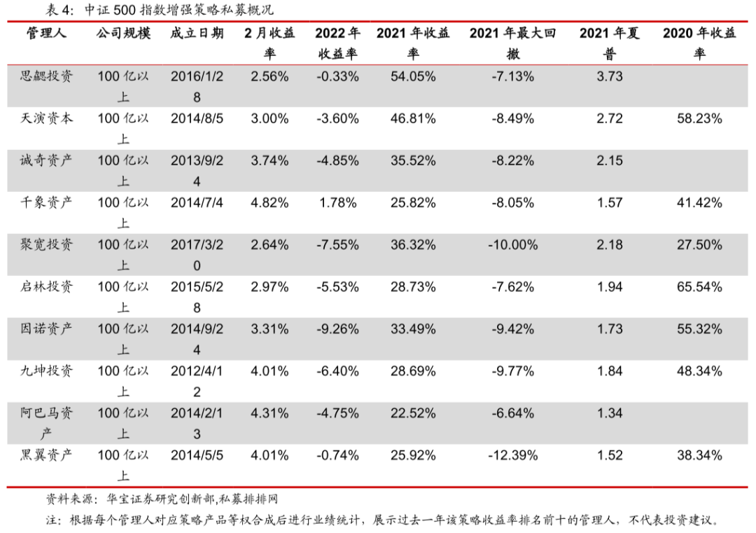 中证500指数增强策略,过去一年收益率排名前十的管理规模均超百亿,2月收益率均为正,最高的是千象资产,录得了4.82%的单月收益,当月中证500指数上涨了4.15%。2021年收益最高的也是思勰投资,录得了54.05%的收益,夏普比3.73也是2021年最高,最大回撤幅度最小的是阿巴马资产的6.64%。