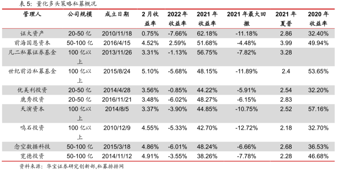 量化多头策略,过去一年收益率排名前十中有四家管理规模超百亿,2月收益率均为正,最高的是世纪前沿,录得了5.1%的单月收益。2021年收益最高的是证大资产,录得了62.18%的收益,前海国恩的夏普比3.99最高,最大回撤幅度4.48%也是最小。