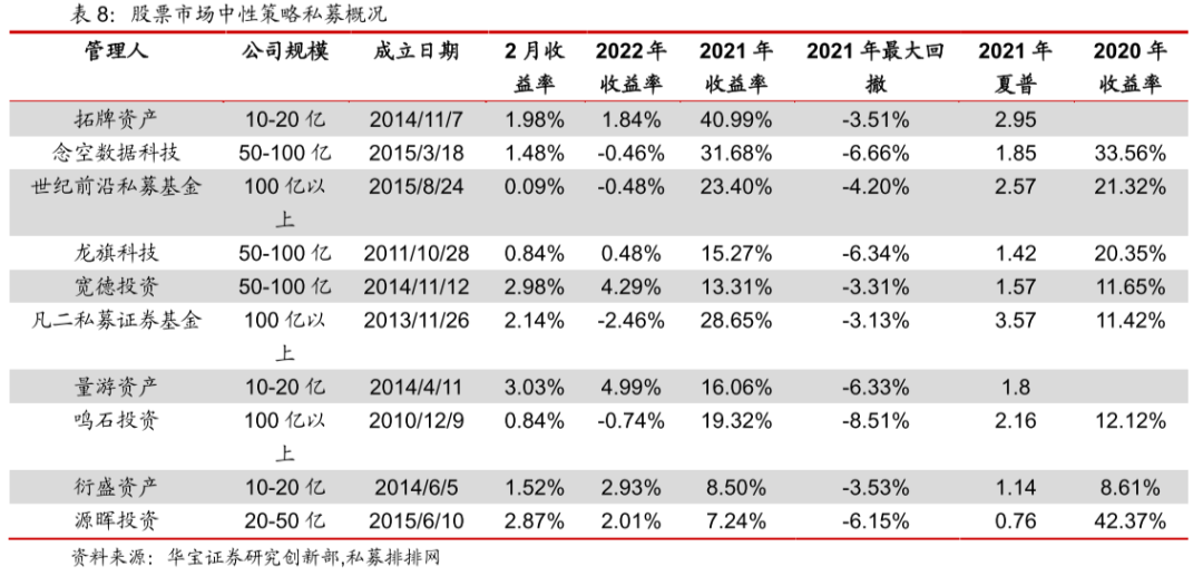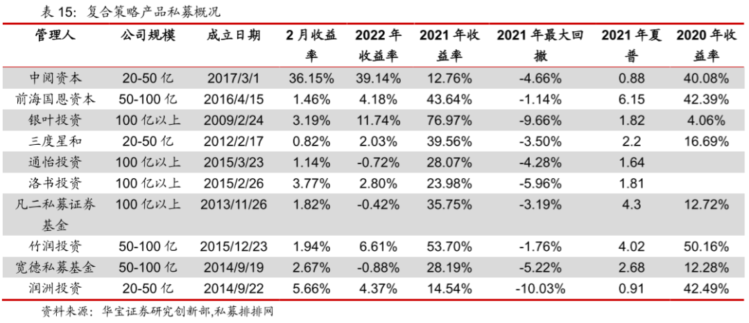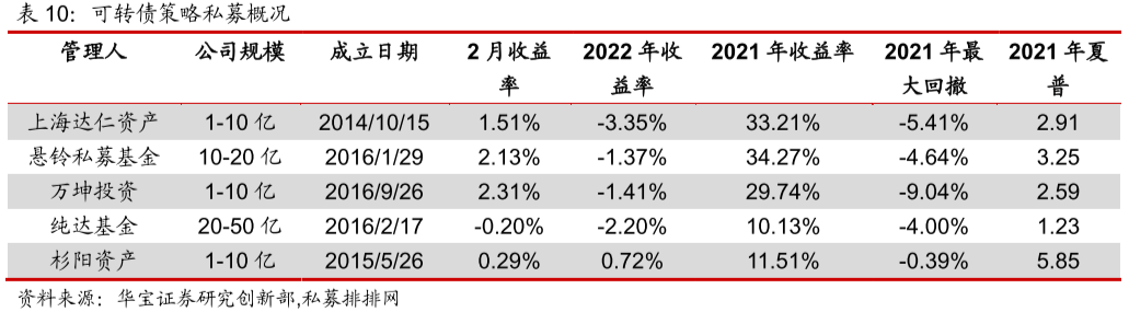 可转债策略,2月收益率有四家为正,最高的是万坤投资,录得了2.31%的单月收益。2021年收益最高的是悬铃资产,录得了34.27%的收益,最高的夏普比是杉阳资产的5.85,最小的最大回撤幅度也是杉阳资产的0.39%。