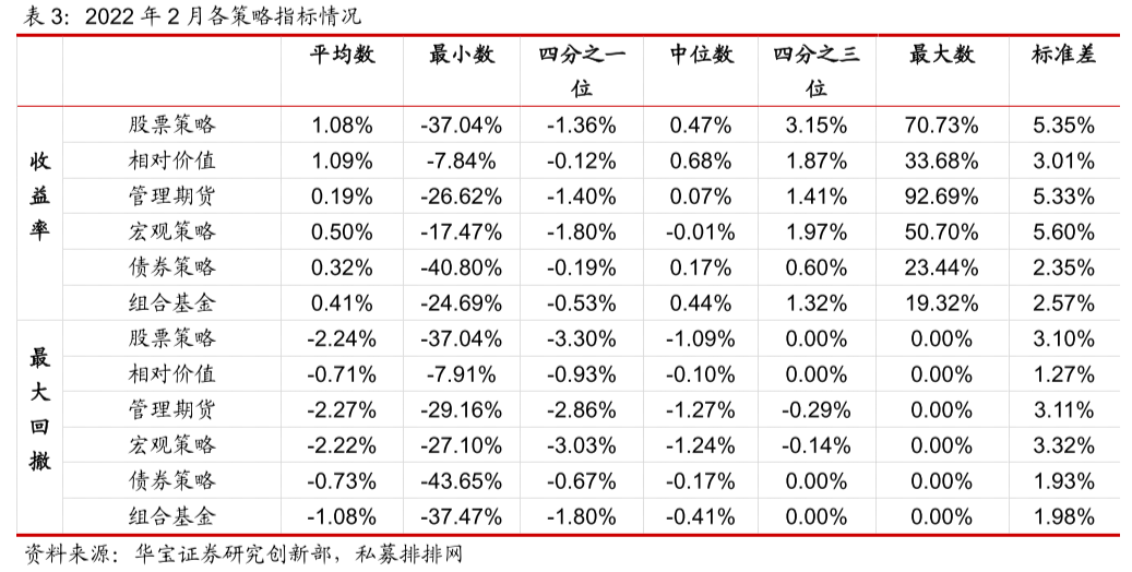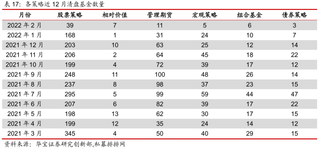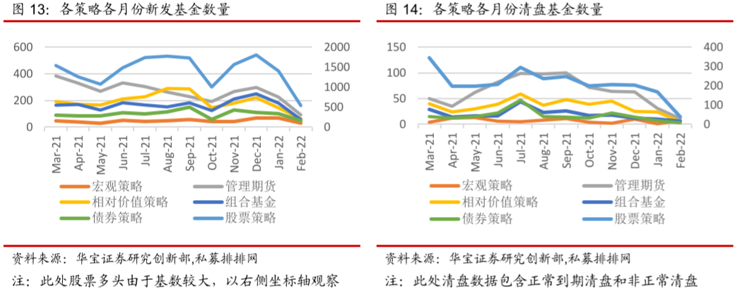 产品发行与清盘:从产品发行来看,2022年2月,受春节因素影响,多数策略发行数量回落。从产品清盘来看,各月份清盘数量基本保持稳定,2月因为春节假期因素清盘数量较其它月份少,其余月份随行情波动不大。