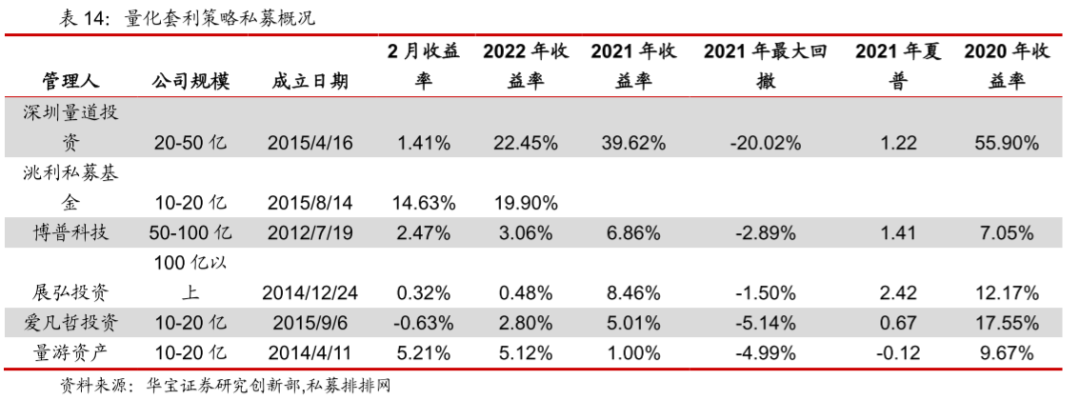 量化套利策略,过去一年收益率排名前六中有三家管理规模超二十亿,2月收益率五家为正,最高的是洮利录得了14.63%的单月收益。2021年收益最高的是量道投资,录得了39.62%的收益,夏普比最高的是展弘投资的2.42,展弘投资的最大回撤幅度也最小,为1.5%。