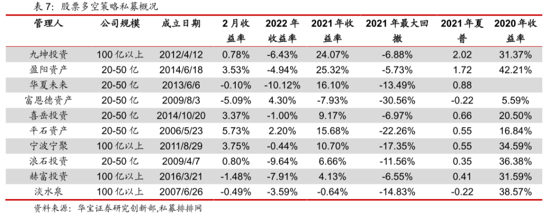 股票多空策略,过去一年收益率排名前十家中有四家管理规模超百亿,2月收益率有六家为正,最高的是平石资产,录得了5.73%的单月收益。2021年收益最高的是盈阳资产,录得了25.32%的收益,夏普比最高的是九坤投资的2.02,最大回撤幅度最小的是盈阳资产的5.73%。