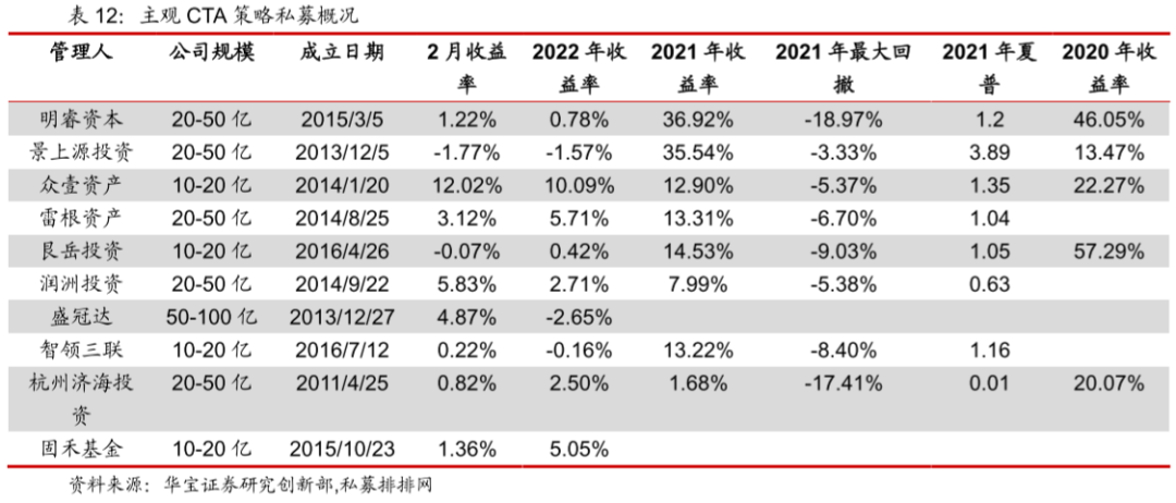 主观CTA策略,过去一年收益率排名前十的2月收益率有八家为正,最高的是众壹资产,录得了12.02%的单月收益。2021年收益最高的是明睿资本,录得了36.92%的收益,最高的夏普比是景上源投资的3.89,最小的最大回撤幅度也是景上源投资的3.33%。