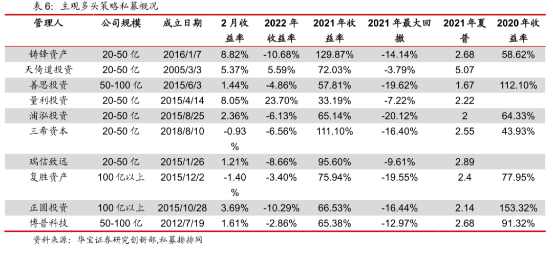 主观多头策略,过去一年收益率排名前十中有四家管理规模超五十亿,2月收益率有八家为正,铸锋资产录得了8.82%的单月收益。2021年收益最高的也是铸锋资产,录得了129.87%的收益,夏普比最高的是天倚道投资的5.07,最大回撤幅度最小的也是天倚道投资的3.79%。