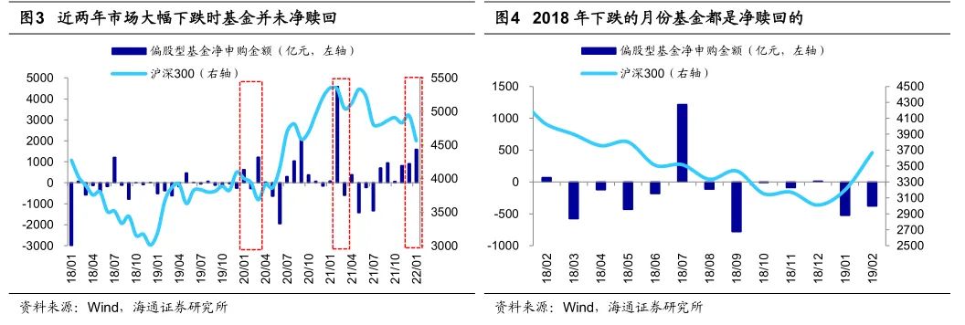 ETF毕竟还是小众,因此还要参考样本更加全的协会公布的月度数据。协会每个月会公布股票型和混合型基金的存量份额,我们把当月新发的偏股型基金剔除后,就能够大致估算出单月基金净申购的规模。在过去三年中市场有三次比较大的回撤,分别是20年3月的全球疫情冲击,21年2月的核心资产大跌以及21年12月以来的成长股大跌。这三次市场下跌中我们发现基金并没有被赎回,20年3月基金净申购了1000多亿元,21年3月净申购4000多亿元以及今年1月基金净申购了1000多亿元,而作为对比,2018年无论是从年度层面看还是从月度层面看,市场下跌时基金都是净赎回的。