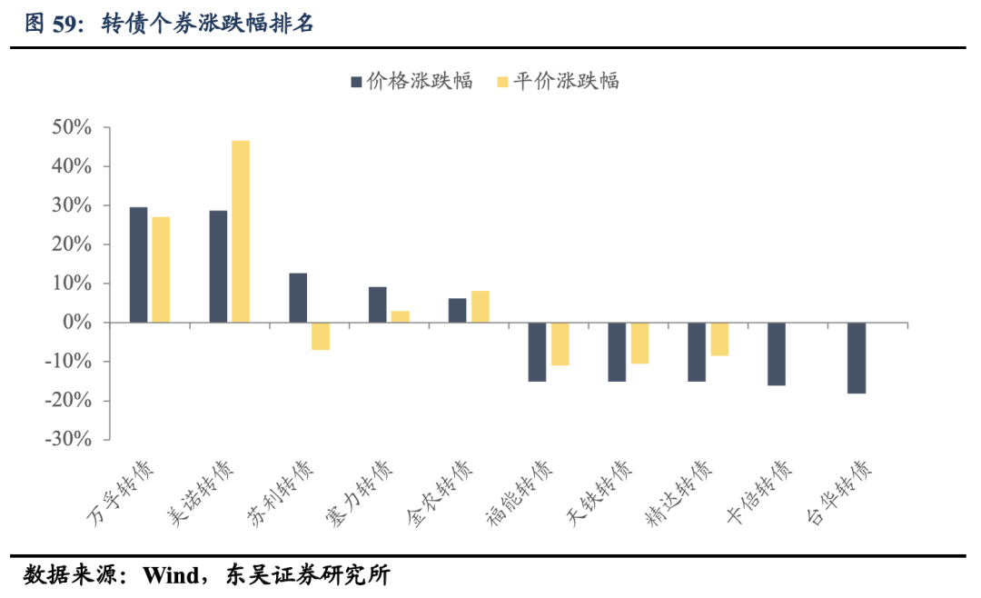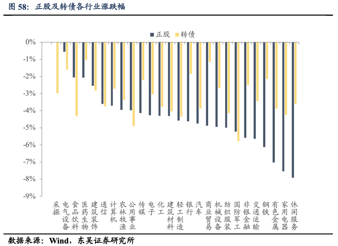 行业方面,全周总体来看,申万一级行业指数采掘(0.00%)维持平稳,而休闲服务(-7.91%)、家用电器(-7.54%)跌幅较大。转债市场来看,本周全部行业收跌,且跌幅明显,国防军工(-5.78%)、公用事业(-4.90%)跌幅较大,而医药生物(-1.04%),商业贸易(-1.14%)跌幅较小。