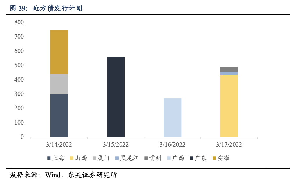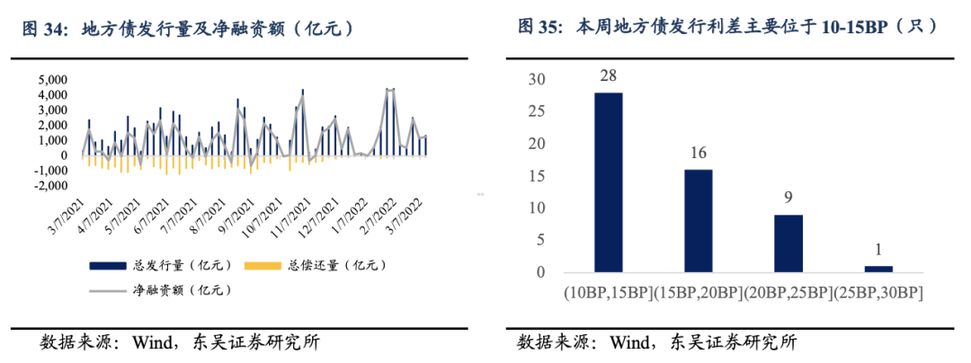 本周(3月7日-3月13日,下同)一级市场地方债共发行54只,发行金额1350.63亿元,其中新增一般债269.91亿元,新增专项债900.40亿元,再融资债180.32亿元,偿还量69.00亿元,净融资额1281.63亿元。本周地方债加权平均招标倍数为25.47倍。新增专项债主要投向为市政建设及产业园区基础设施、保障性安居工程、交通基础设施、社会事业和综合。