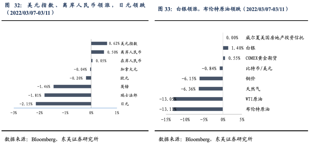 权益市场方面,本周市场的情绪宣泄已经相对充分,技术面已调整到有效支撑位,短期市场已经进入震荡筑底阶段。热门概念依旧,热点板块快速轮动;行业层面,随着两会临近,成长板块景气度持续提升,建议关注数字经济、东数西算、新冠特效药、建筑工程等方向:周一,题材概念普遍下跌,旅游、航空、酒店餐饮等经济复苏主题概念股全线重挫,芯片、5G、消费电子、手游、汽车、白酒、教育等板块普遍大跌,新能源赛道股继续走弱,新冠药、基建、黄金、石油等概念活跃;周二,两市情绪降至冰点,题材板块近乎全线下跌,煤炭、种业、锂矿、辅助生殖、新冠药、新冠检测、婴童概念等板块普遍大跌,中俄贸易、航运、氢能源等概念大跌靠前,一线白酒股强势,半导体股走势分化,东数西算概念相对强势;周三,市场避险情绪高涨,行业板块普遍下跌,东数西算、煤炭行业、贵金属、光伏设备、工程建设、绿色电力、公用事业、电力行业等板块涨幅靠前,能源金属、采掘行业、基本金属、宠物经济、托育服务、有色金属、证券等板块则跌幅较大;周四,市场情绪以修复为主,板块方面,医药股全天强势,新冠药、新冠治疗、辅助生殖、新冠检测、医疗保健、医药商业等医药相关板块集体走强,新能源股表现强劲,锂电池、绿电、光伏、军工、有机硅、新能源车等概念大涨,贵金属、油气开采、农业、种业、东数西算等板块跌幅居前。此外,化纤、酿酒、电力、建筑、三胎等板块盘中轮动活跃。有色、油气等周期类板块全天调整;周五,新冠检测、农产品、新冠治疗、辅助生殖等板块涨幅居前,种业、新冠药概念、数字货币、券商、农业、旅游等板块大涨,油气开采、托育服务、贵金属、电力、建筑装饰、采掘行业、工程咨询服务、电力行业、光伏设备、能源金属等板块跌幅居前。题材方面,新冠检测、新冠药物、病毒防治、水产养殖、数字货币、券商等概念活跃。