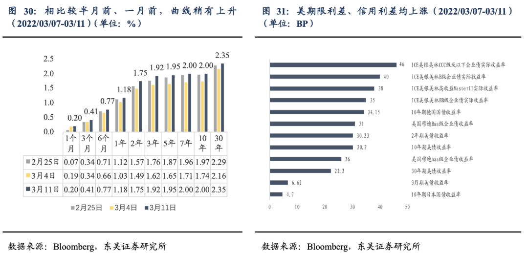 联储缩表方面,美联储当前总资产约8.8万亿美元,是2020年初(疫情前)的4.1万亿美元总资产的两倍以上,我们认为缩表不如加息对流动性的冲击来得强烈,一定程度上,确定的缩表预期,反而会缓释部分加息预期,承担回笼过剩流动性的作用。主要我们认为当前(1)流动性仍明显过剩,联储逆回购余额达到1.8万亿美元,财政部账户余额2022年3月反弹至7000万美元,合计2.5万亿,我们把两者之后作为观测流动性过剩的一个指标,这个指标近期反弹明显,意味着过剩的情况并没有出现缓解;(2)前期Taper提速后是300亿美元/月(200亿国债,100亿MBS),前期2017~2019年缩表时,最快的节奏是900亿美元/月(600亿国债,300亿MBS),以这一方式为基准,从2022年6月开始启动缩表的话,至年底将缩减约5400亿美元规模,相比较过剩流动性来说,并不足够大到产生明显的冲击。(3)联储收益率曲线当前正无比平坦,过往扩张期前期都有约250bp的空间,而当前仅剩25bp,相差10倍,这意味着为了不让曲线倒挂,缩表需要配合加息来进行。