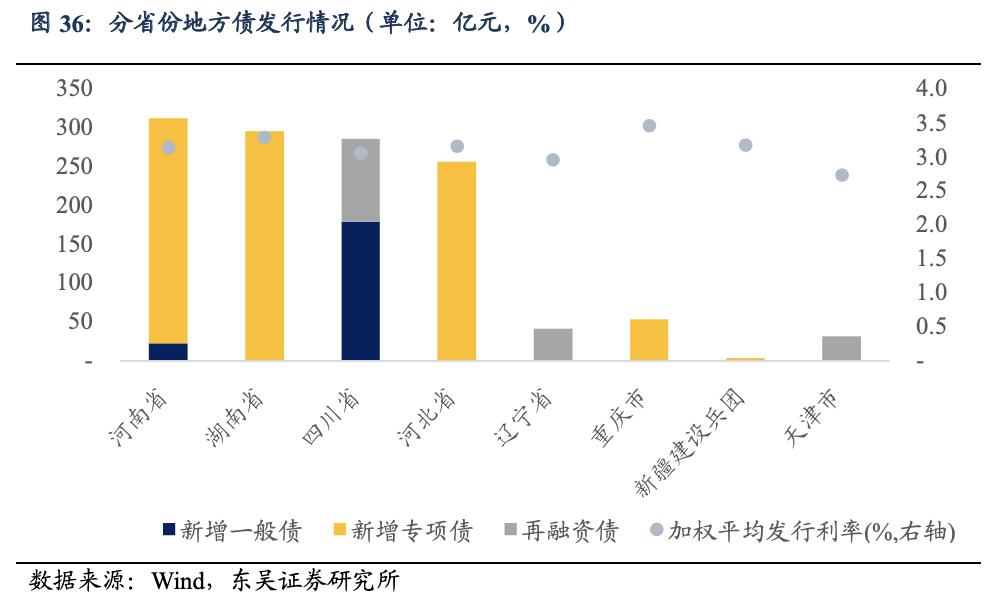 本周有8个省市发行地方债,发行量前5位分别为河南省、湖南省、四川省、河北省和辽宁省,分别发行312.99亿元,295.96亿元,286.09亿元,256.45亿元,74.68亿元。