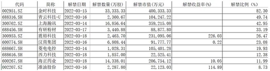 其中,金时科技、上海瀚讯、震裕科技解禁市值居前,分别为40.03亿元、35.92亿元、23.11亿元。其中,金时科技解禁股比例达82.30%。此外,兰卫医学解禁股收益率超过8倍。